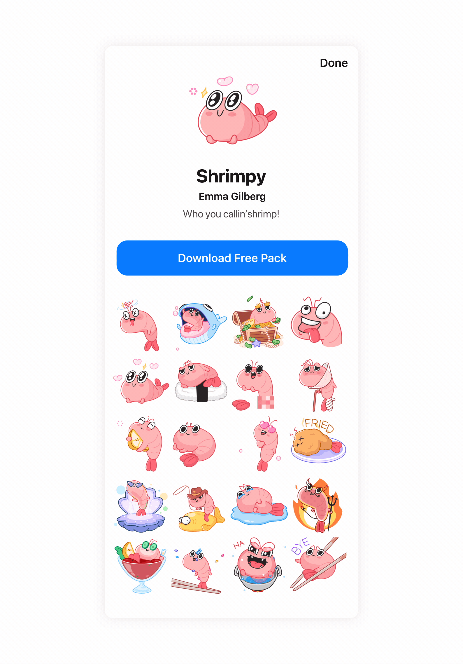 I was commissioned by Meta to create multiple sticker packs for Messenger! After Frog and Dog, Meta asked me to create another pack, and allowed me to design a character around my signature mascot, a shrimp.