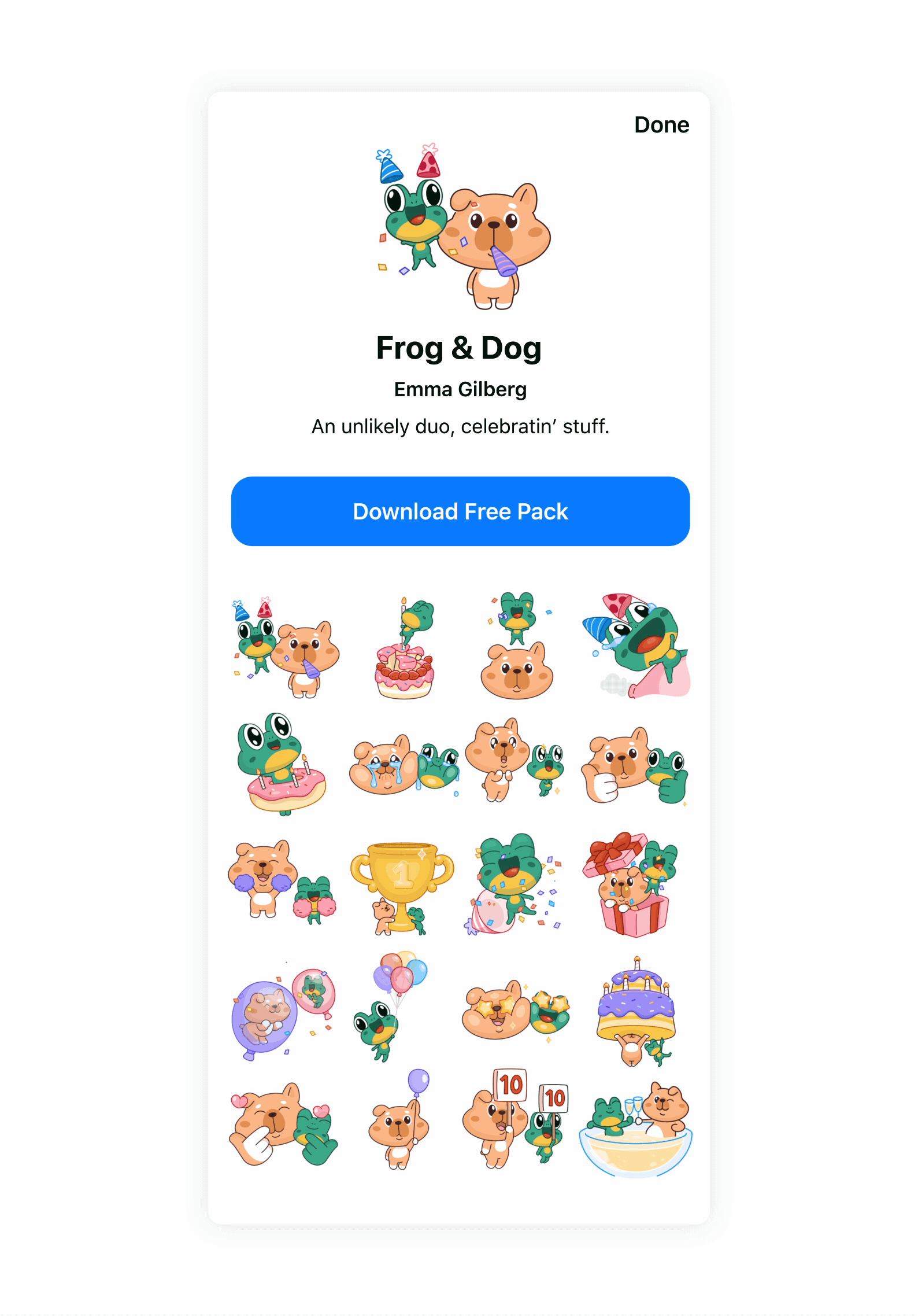 I was commissioned by Meta to create multiple sticker packs for Messenger! Conceptually, the first brief was simple: create a character or theme around “celebration.” Execution-wise, the brief was more complicated: these stickers needed to be ultra smooth at 60fps, and lottie compatible across all platforms (desktop, ios, android, etc). I came up with a bunch of characters and concepts and we landed on the unlikely duo of Frog and Dog. I had so much fun concepting, illustrating and animating these guys. You can find them available for free on the Facebook sticker store!